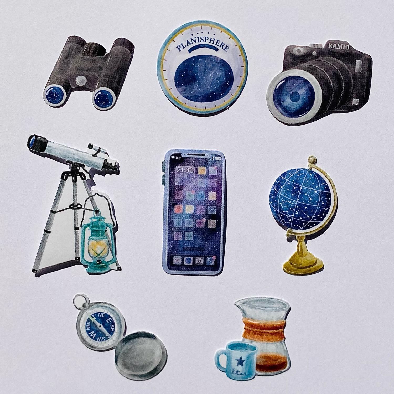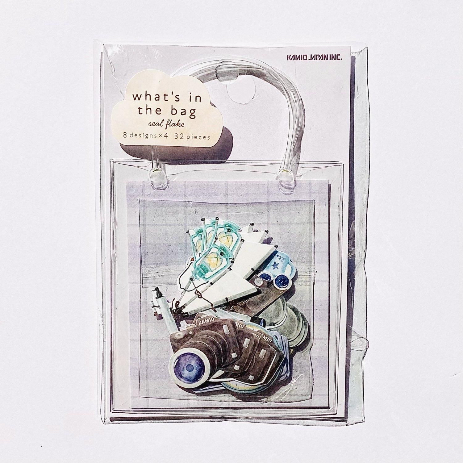 学校、星空観察、図書館やピクニックなど、お出かけ先にちなんだ「持ち物」をバッグに詰めたフレークシールです。