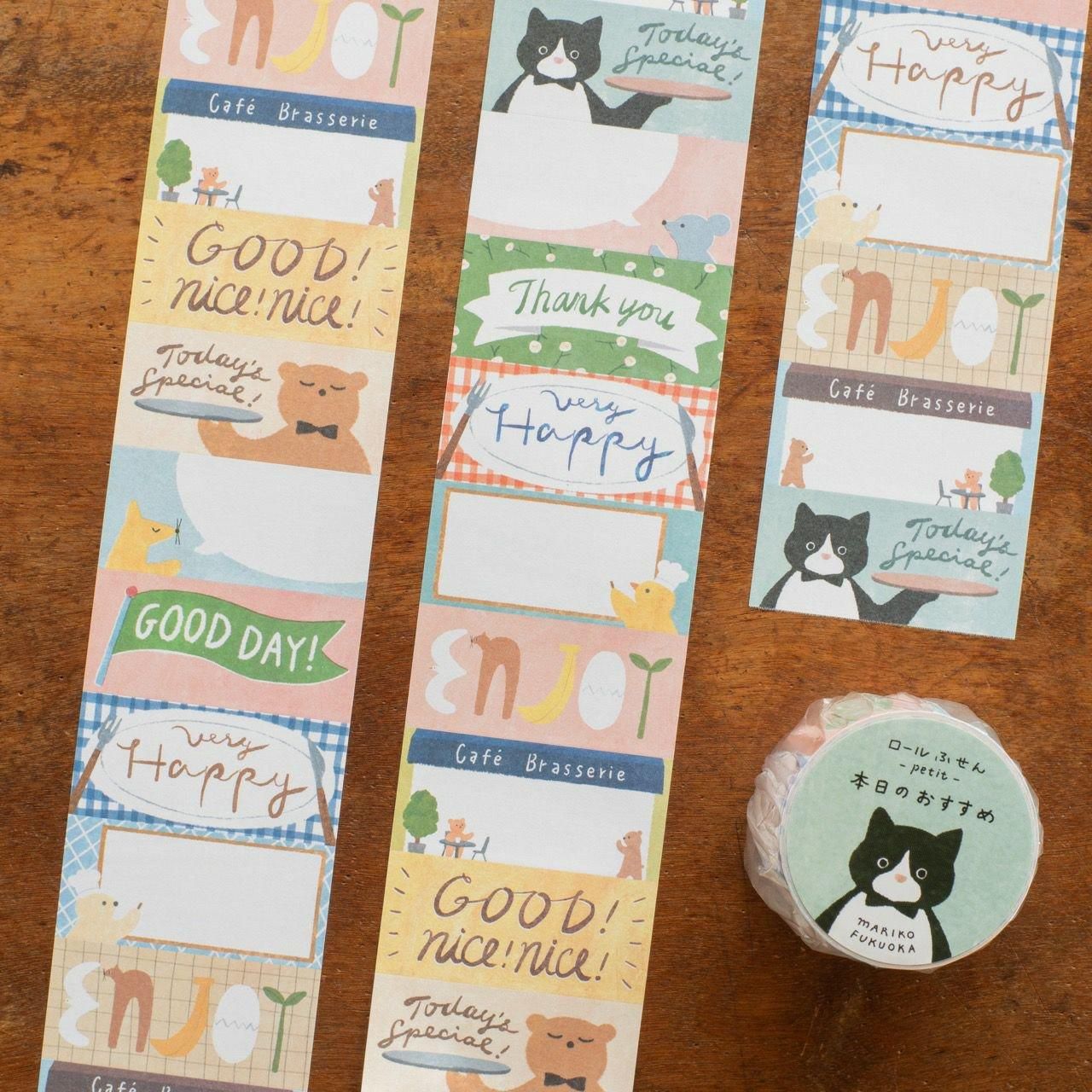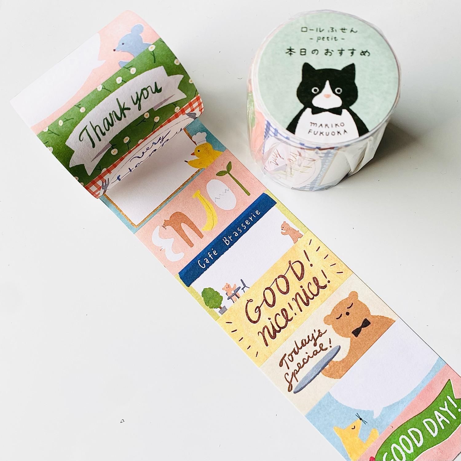 手紙社オリジナル商品で人気のロール付箋に、新しく「ロール付箋petit(プチ)」が登場です! ロール付箋よりもコンパクトなサイズで文字ラベルも多く、手帳デコやノートの見出しに使いやすいデザイン。ひと巻きに9柄100枚たっぷりロールされているので惜しみなくお使いいただけます。 福岡麻利子さんが手がけてくれた、動物たちが働くレストランのメニュー風の「本日のおすすめ」は、美味しいものを食べたハッピーな日の手帳デコにぴったりです! 「ENJOY」ラベルに描かれた動物にもぜひご注目ください!