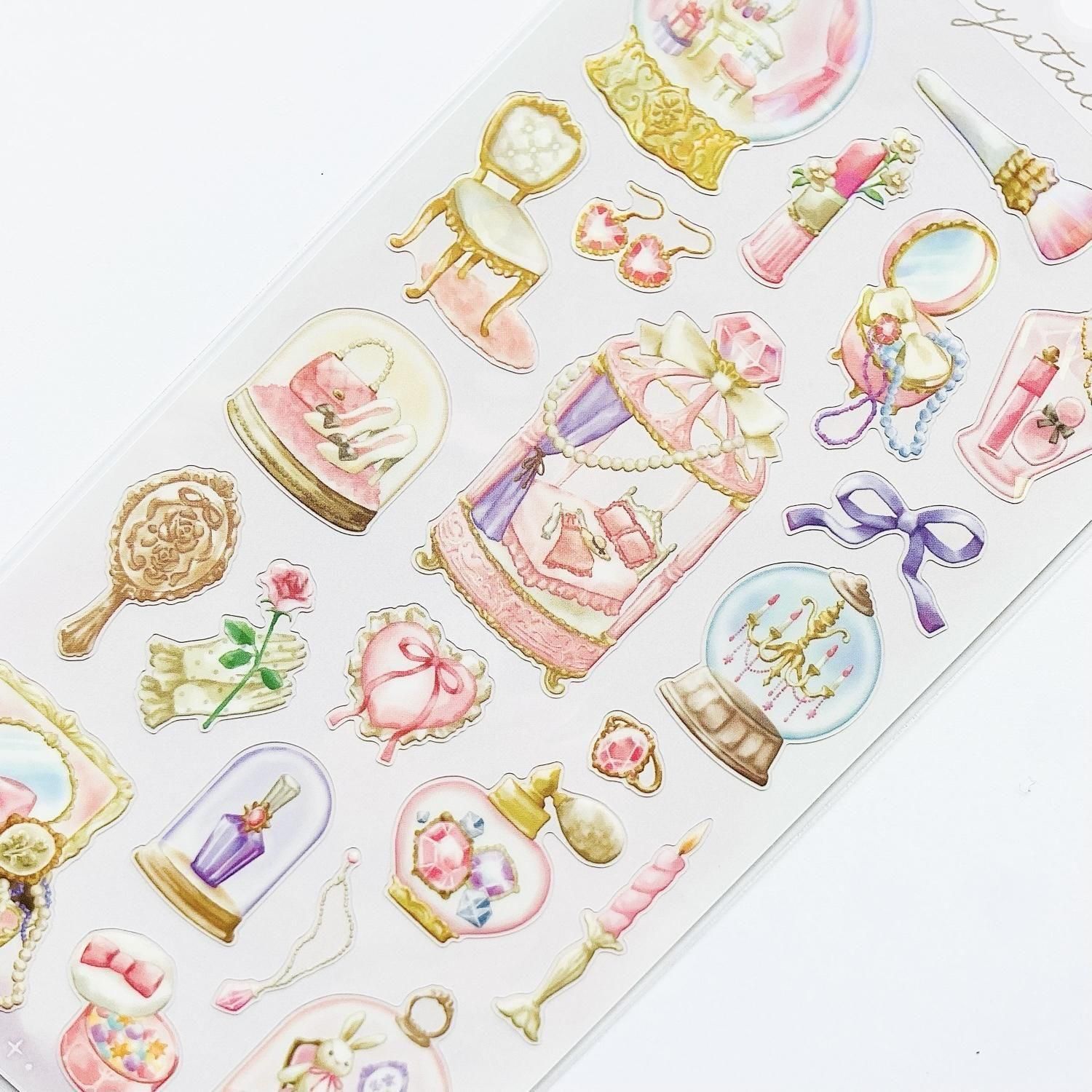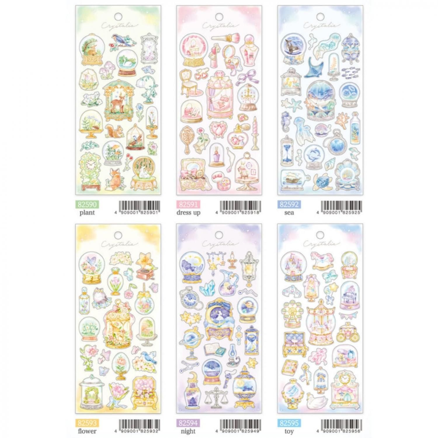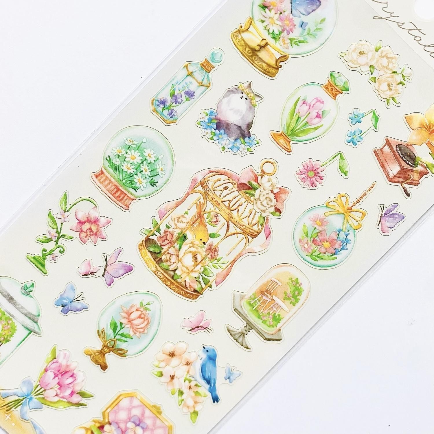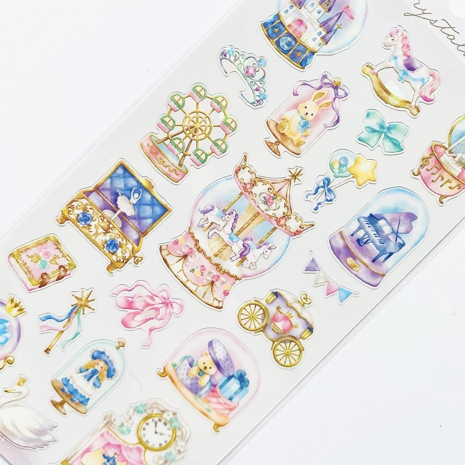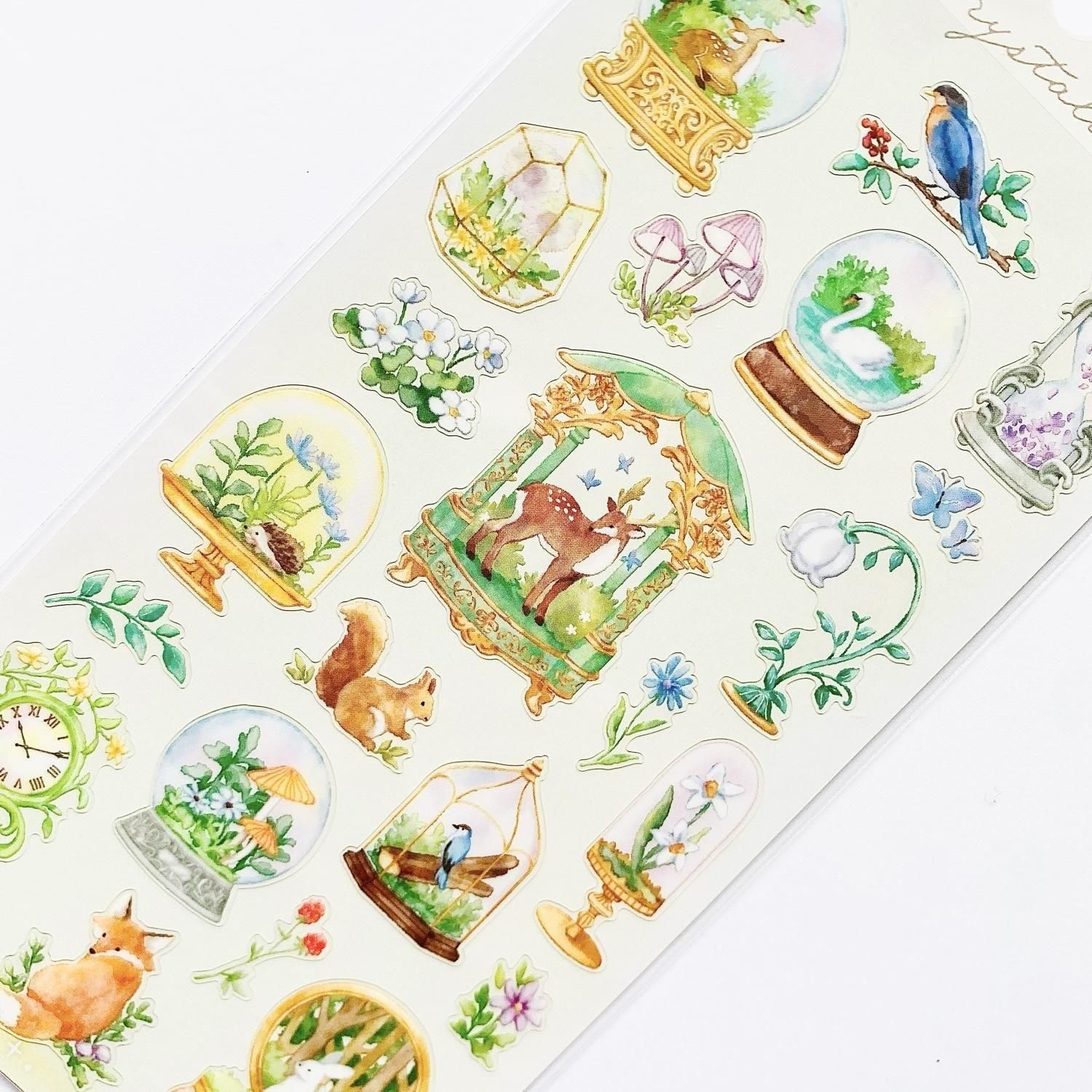 スノードームやテラリウムのようなガラス容器にファンタジーな世界観やモチーフを閉じ込めたイラストシールです。キラキラひかるホログラム仕様です。