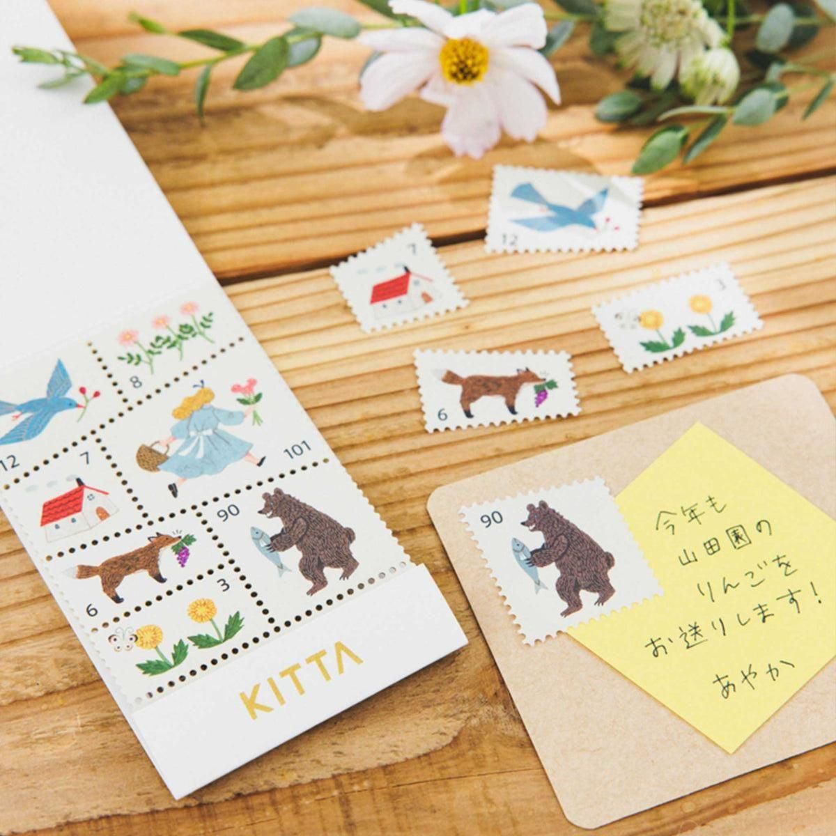 かさばらないから「持ち歩ける」切れてるから「使いやすい」コンパクトな、マスキングテープです。 好きな位置や大きさでピリッと切り取れる、 切手風の貼ってはがせるマスキングシールです。 1シートにいろいろなサイズがはいっているので、使いたい場所にあわせて選べます。 朝の森をイメージした絵本のようなイラストで、複数枚つなげて使うのもおすすめです。